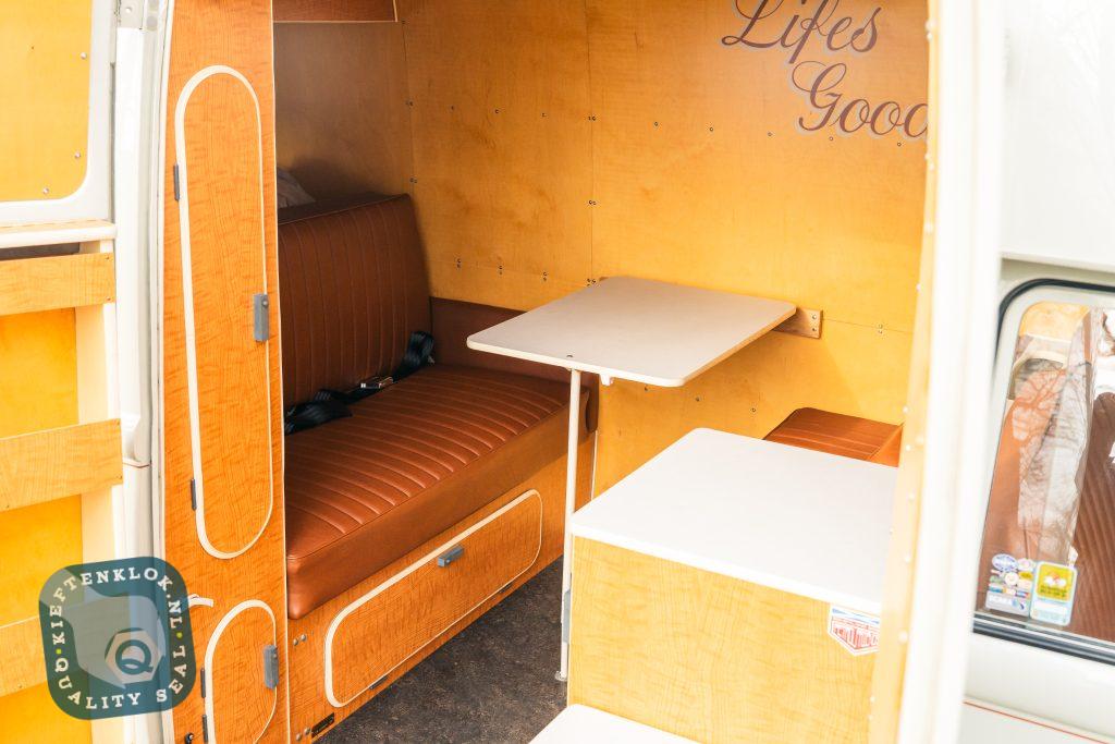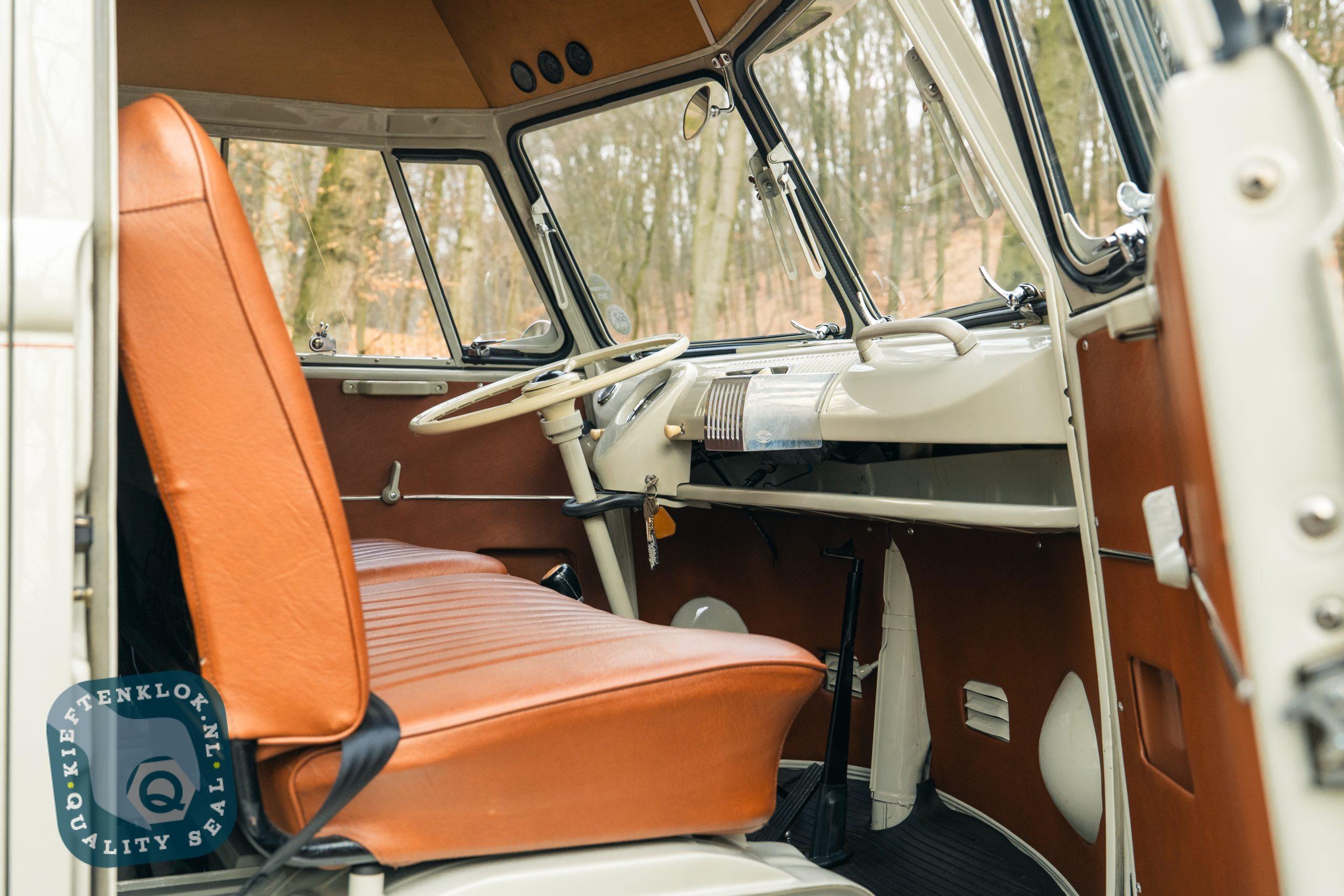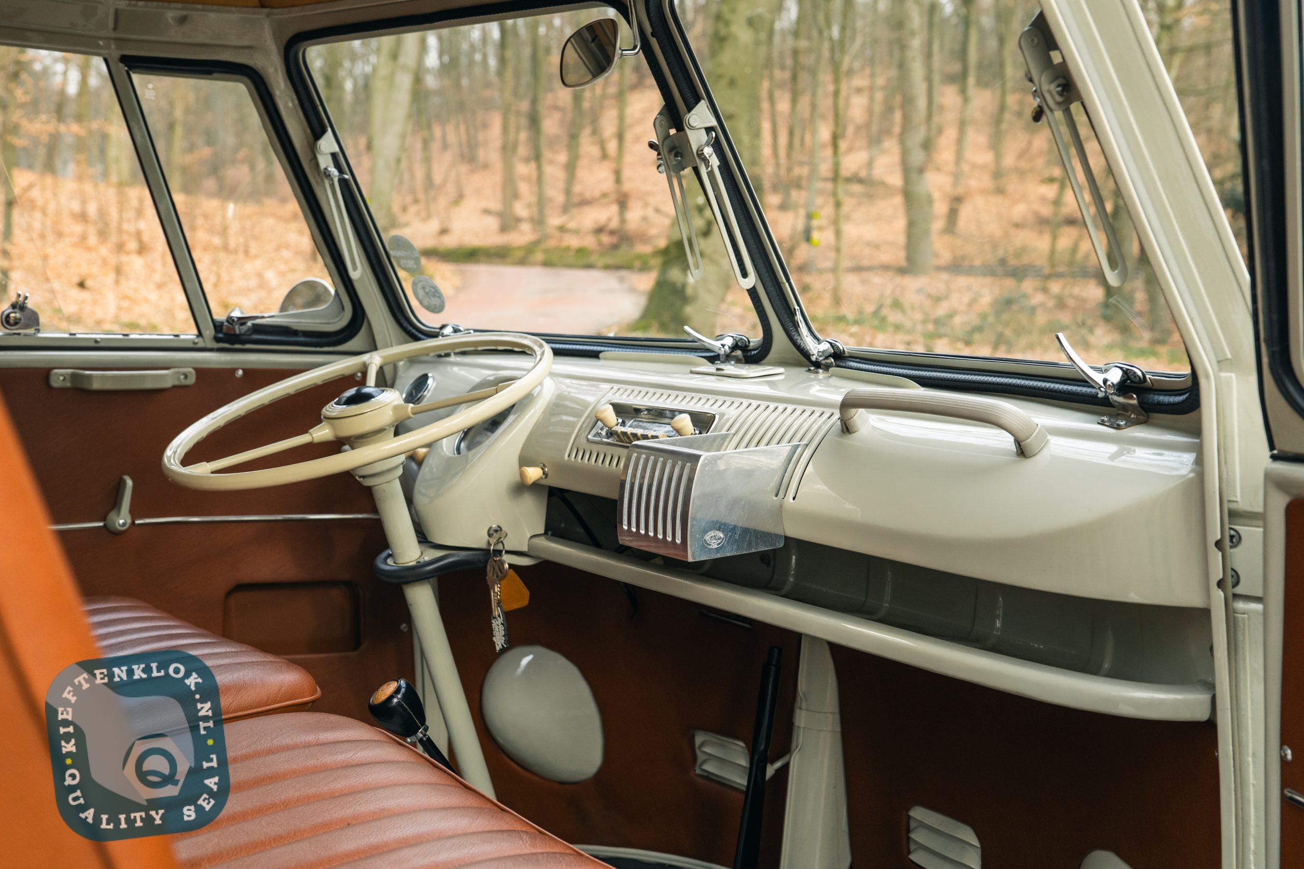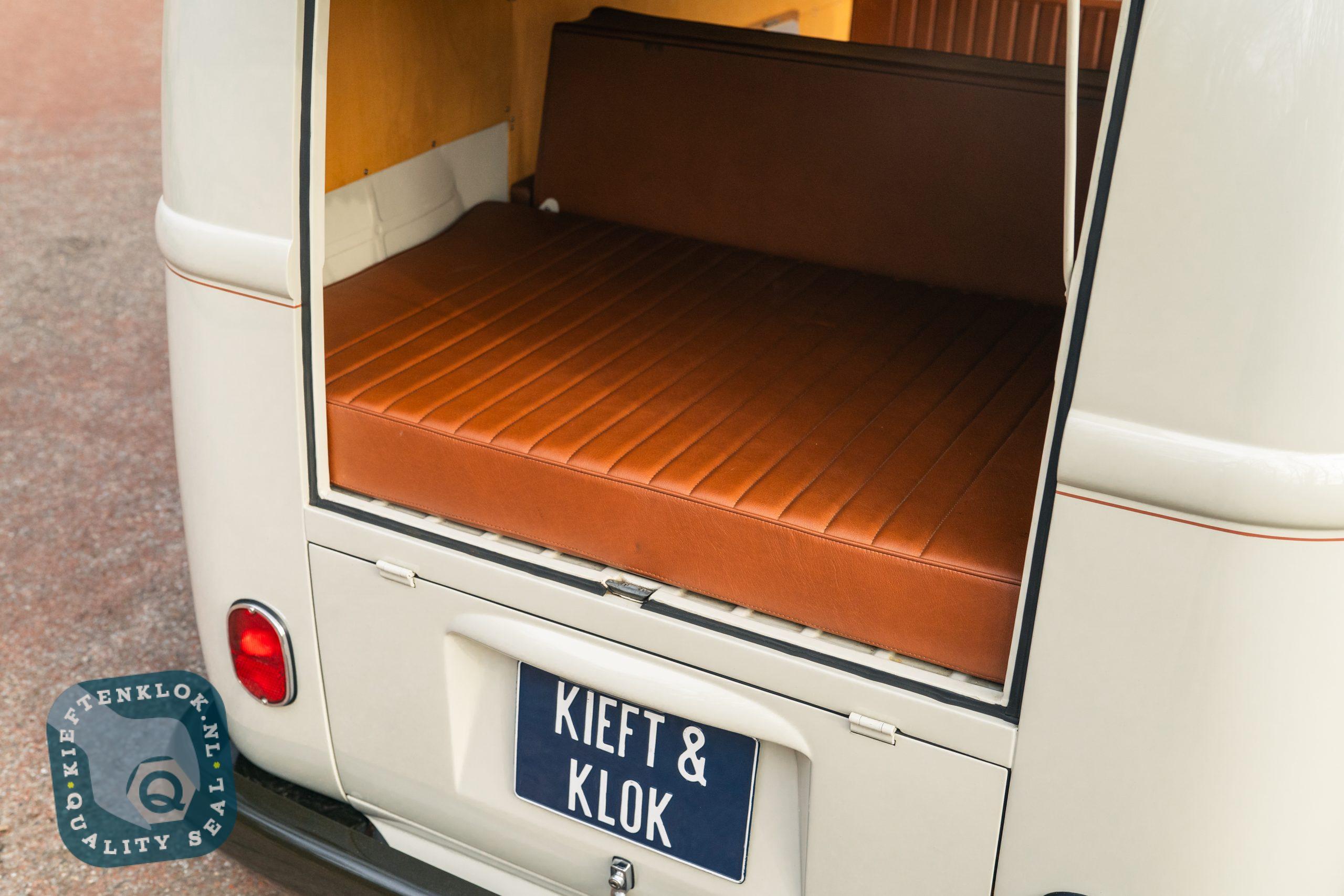 Der Innenraum ist komplett ausgestattet mit einem maßgefertigten Westfalia SO42-Interieur, Ledersitzen und Türverkleidungen, Gentleman Drivers Barndoor-Style Lenkrad, Safari-Fenstern sowie einer handgezogenen „One-Shot“ Pinstripe-Zierlinie („Nefarious“ Beltline).