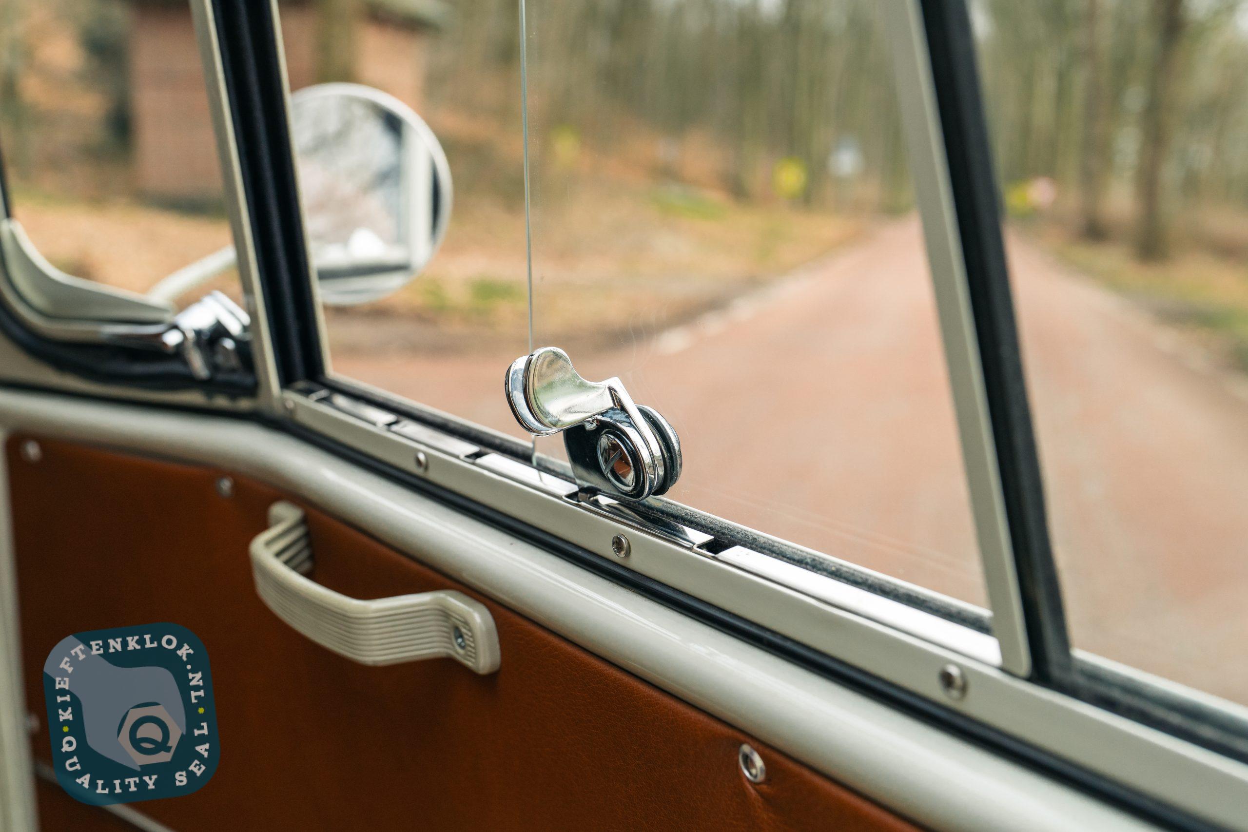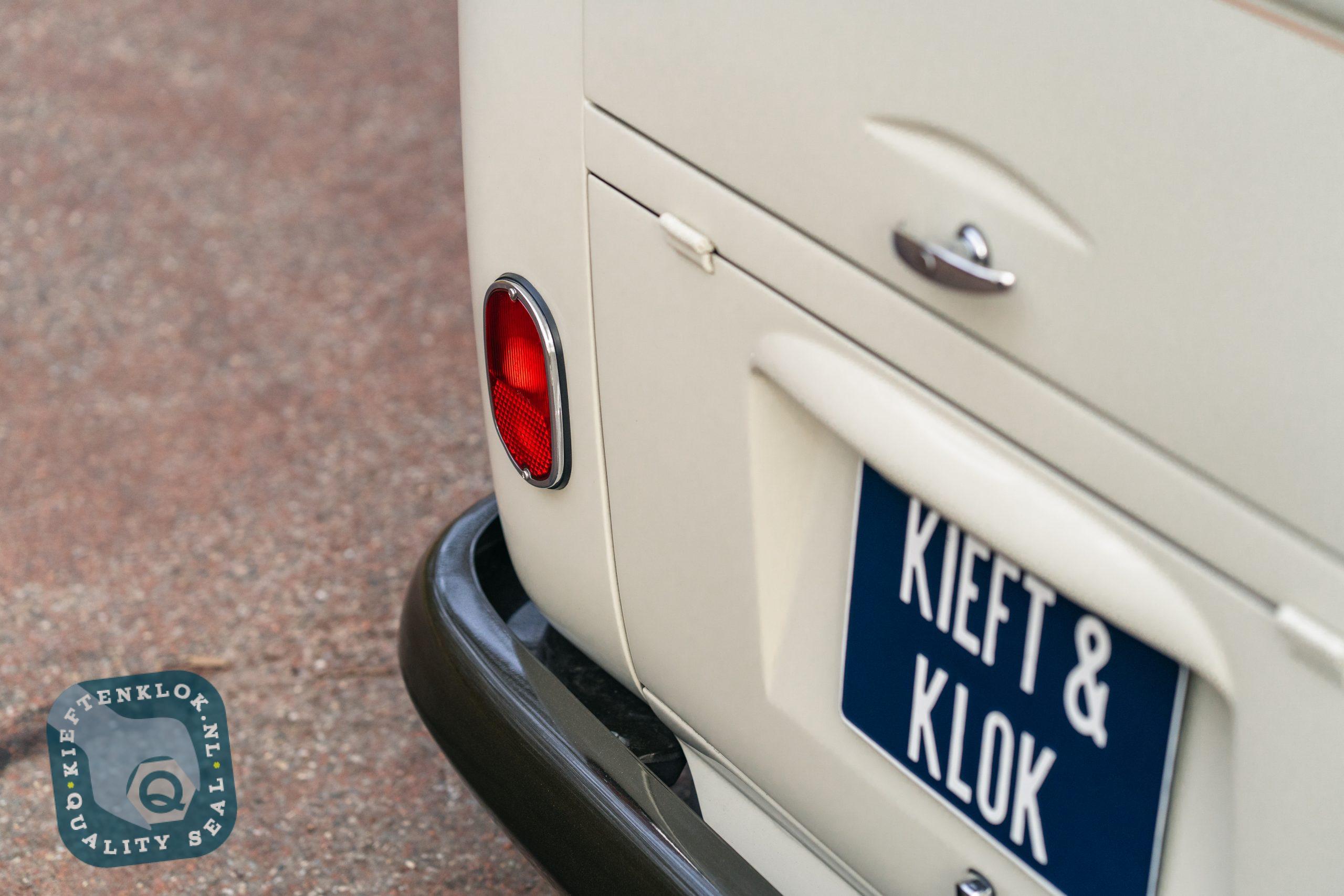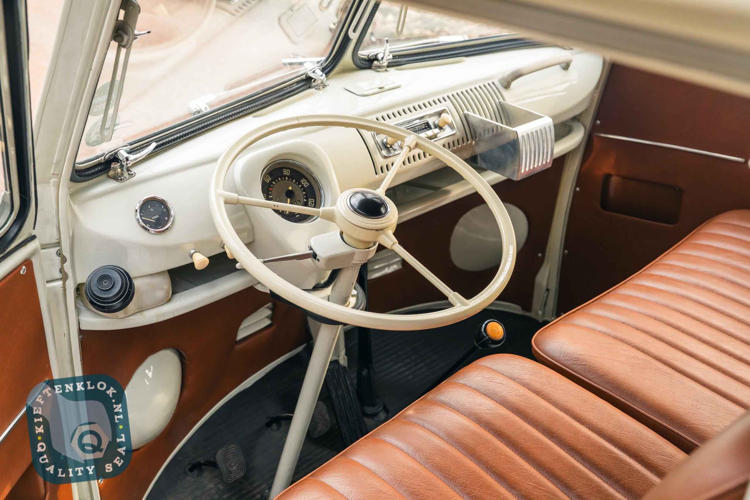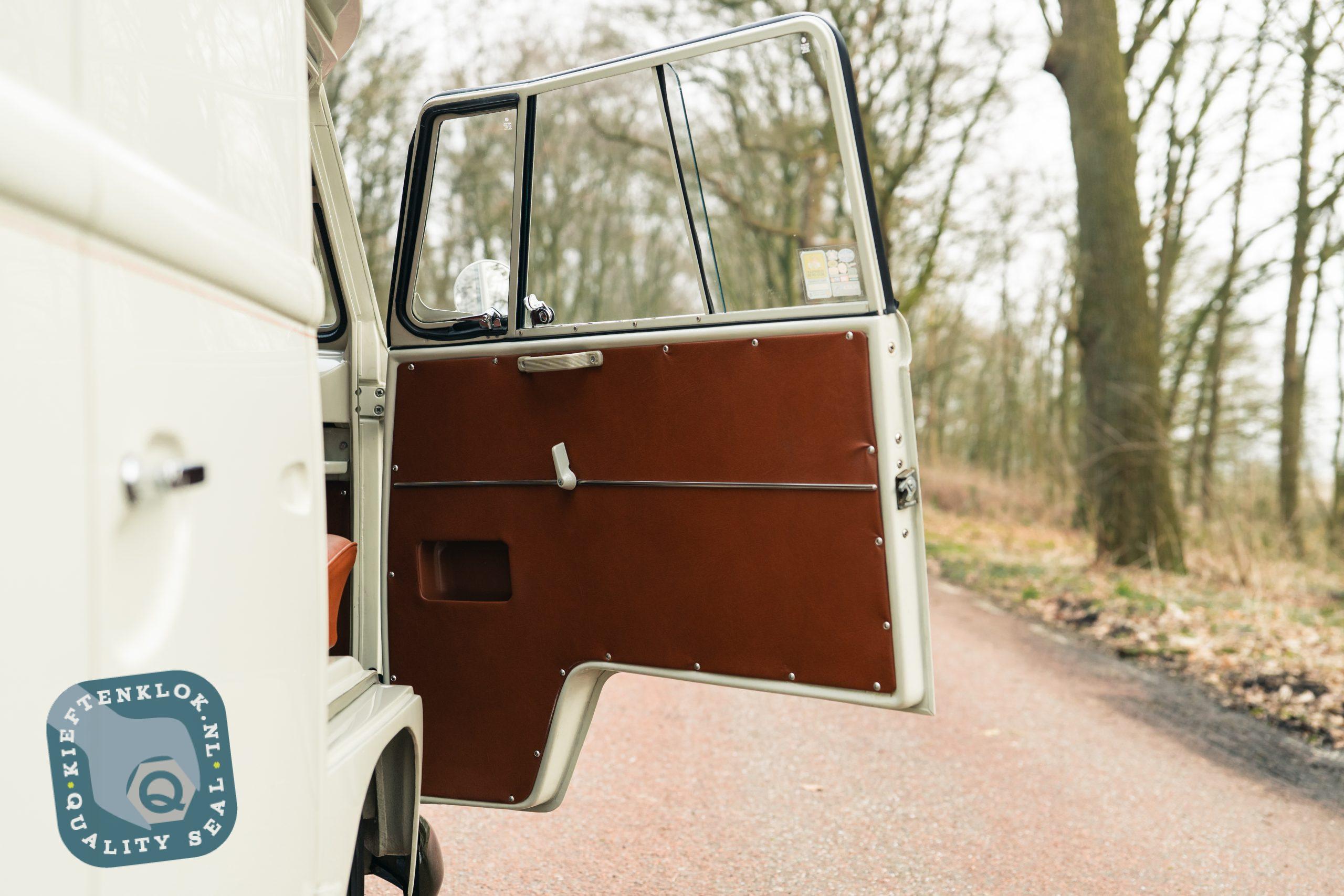 Der Innenraum ist komplett ausgestattet mit einem maßgefertigten Westfalia SO42-Interieur, Ledersitzen und Türverkleidungen, Gentleman Drivers Barndoor-Style Lenkrad, Safari-Fenstern sowie einer handgezogenen „One-Shot“ Pinstripe-Zierlinie („Nefarious“ Beltline).