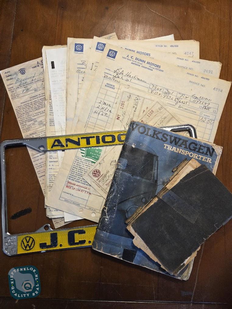 Dieser T1 wurde 1964 neu in Antioch beim Volkswagen-Händler J.C. Dunn Motors ausgeliefert. Ein besonderes Detail: Die originale Kaufrechnung ist noch vorhanden, ebenso wie zahlreiche weitere Belege aus der Vergangenheit. Sogar der originale Kennzeichenhalter des Händlers ist erhalten geblieben – ein seltenes Stück Authentizität.