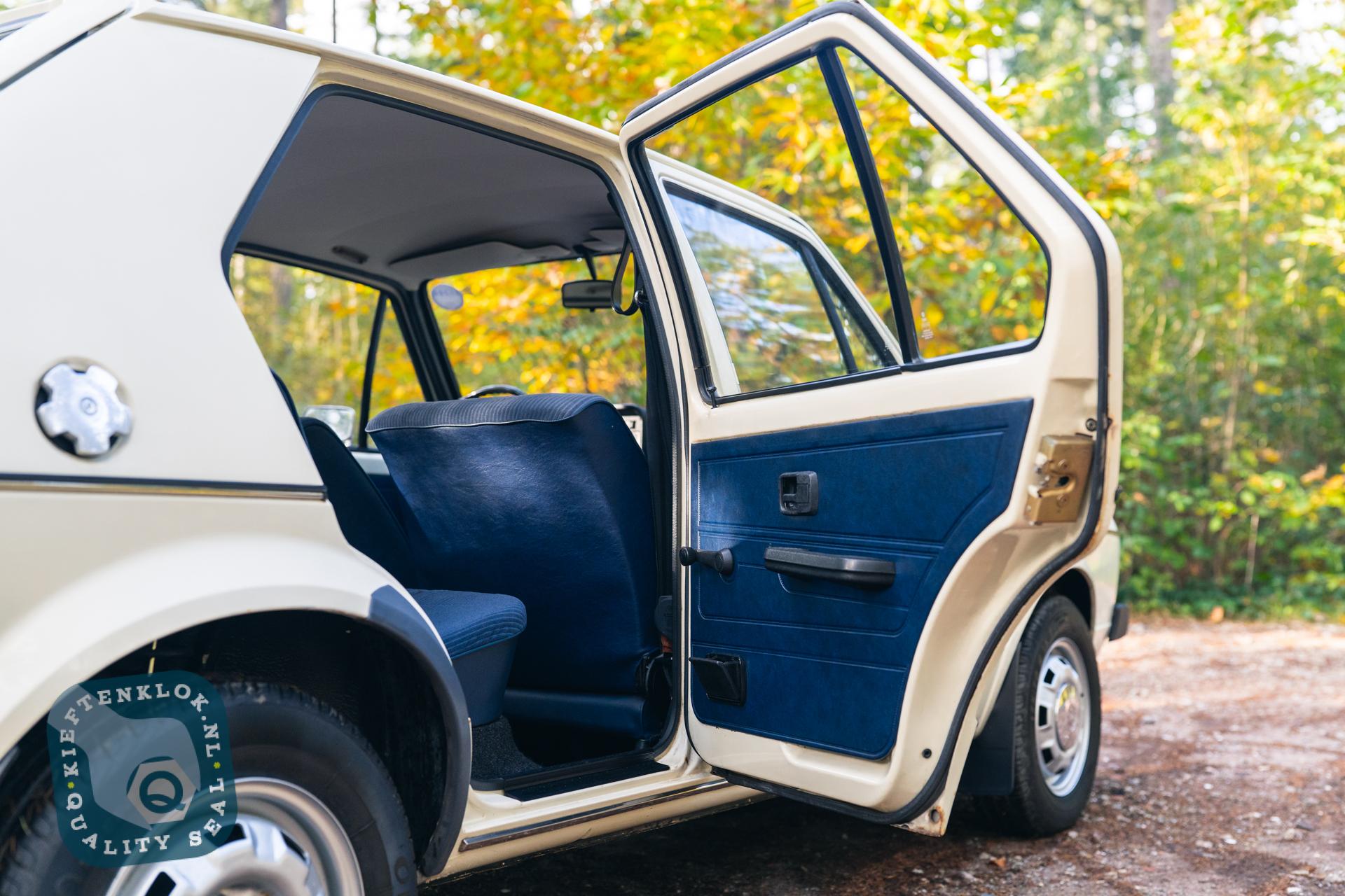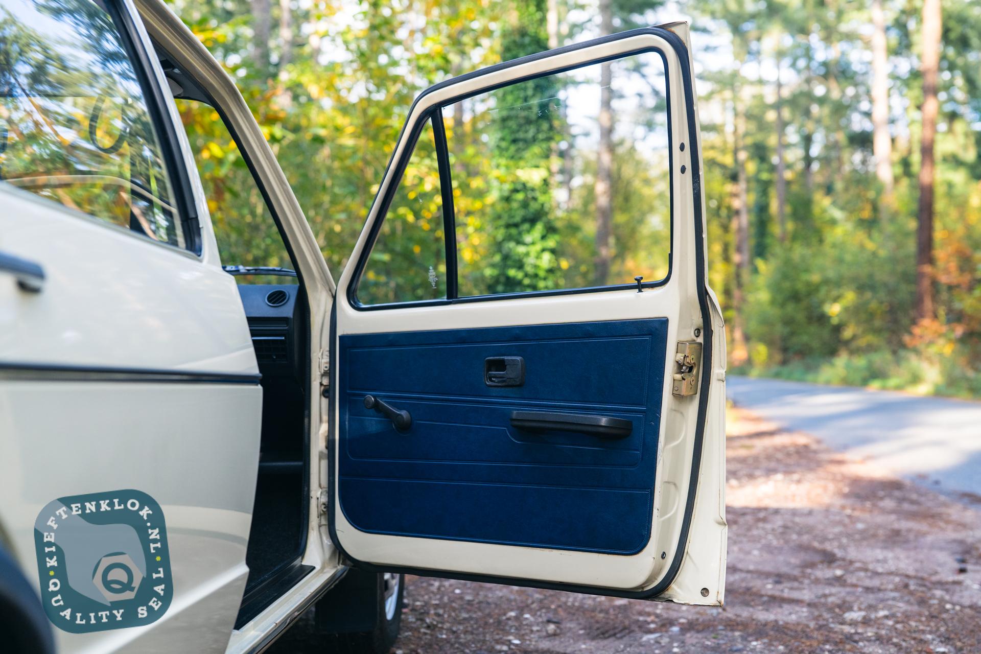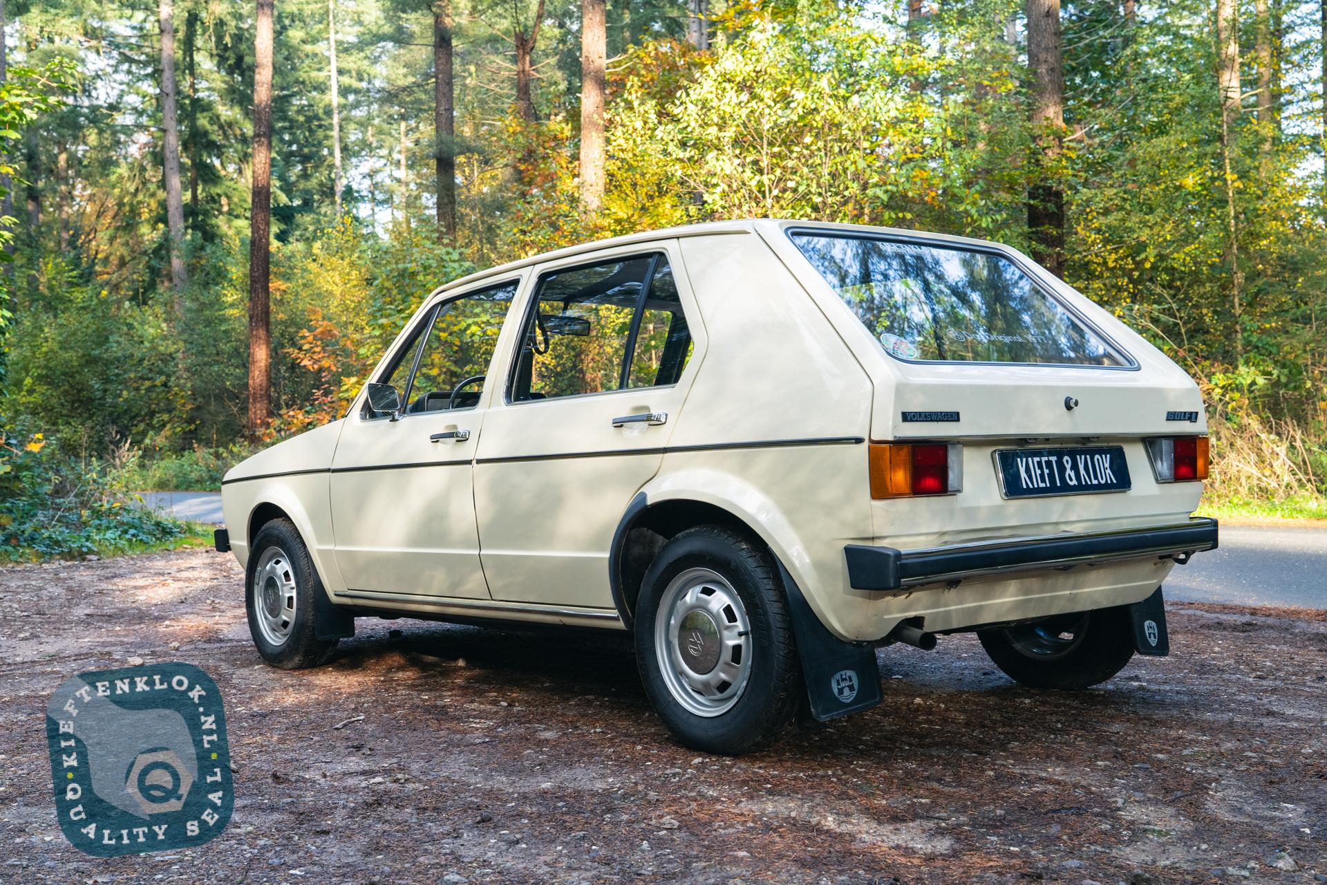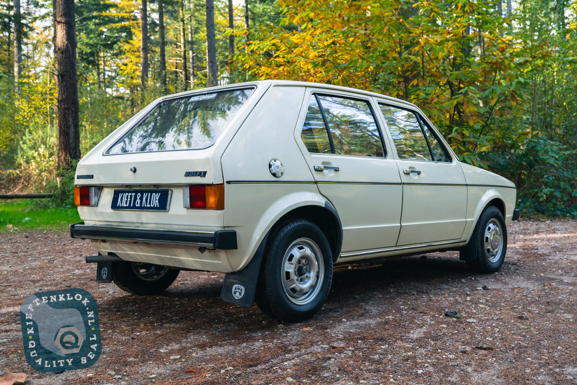 Dit is de praktische vijfdeursversie van de allereerste Golf-generatie, nog met de karakteristieke kleine chromen bumpers, chroom spiegels en chroom deurklinken. De auto is ongelast en vertoont enkel wat lichte gebruikssporen – precies wat je mag verwachten van een eerlijke klassieker.