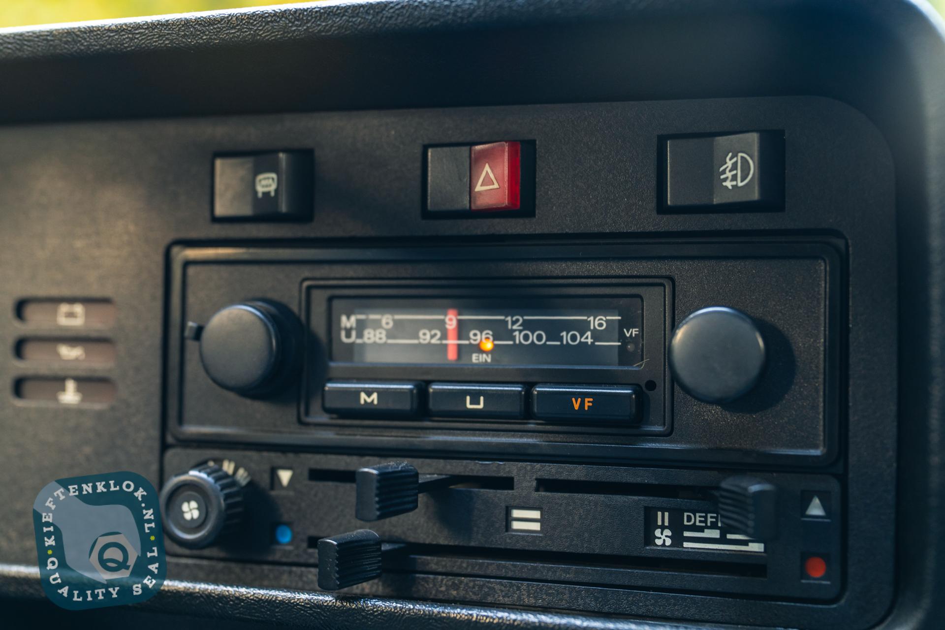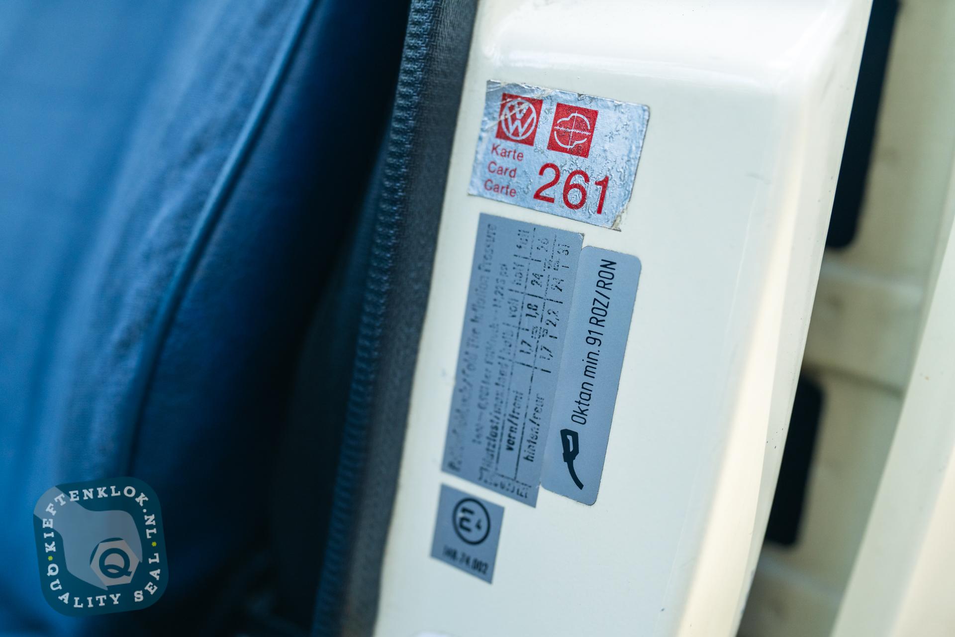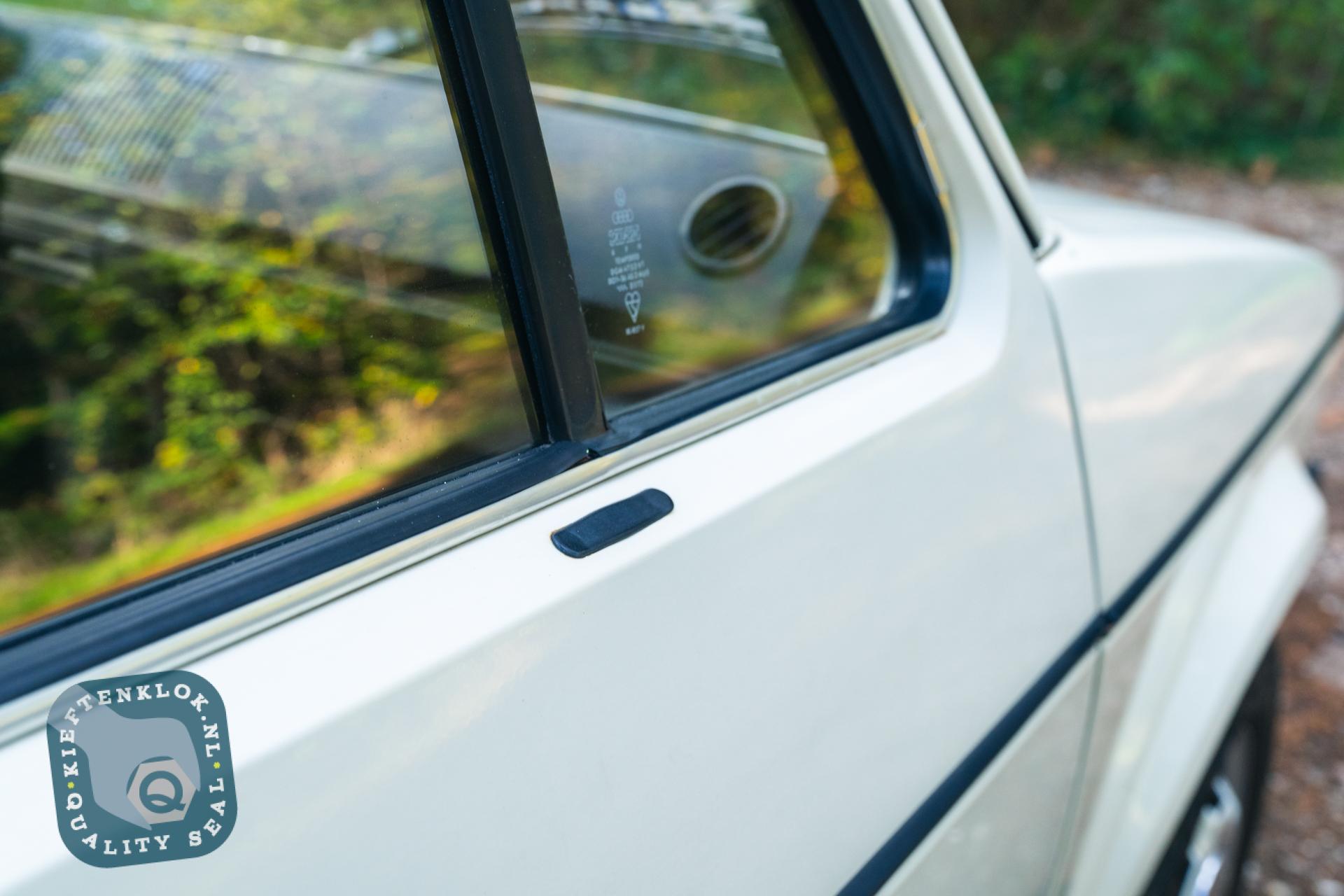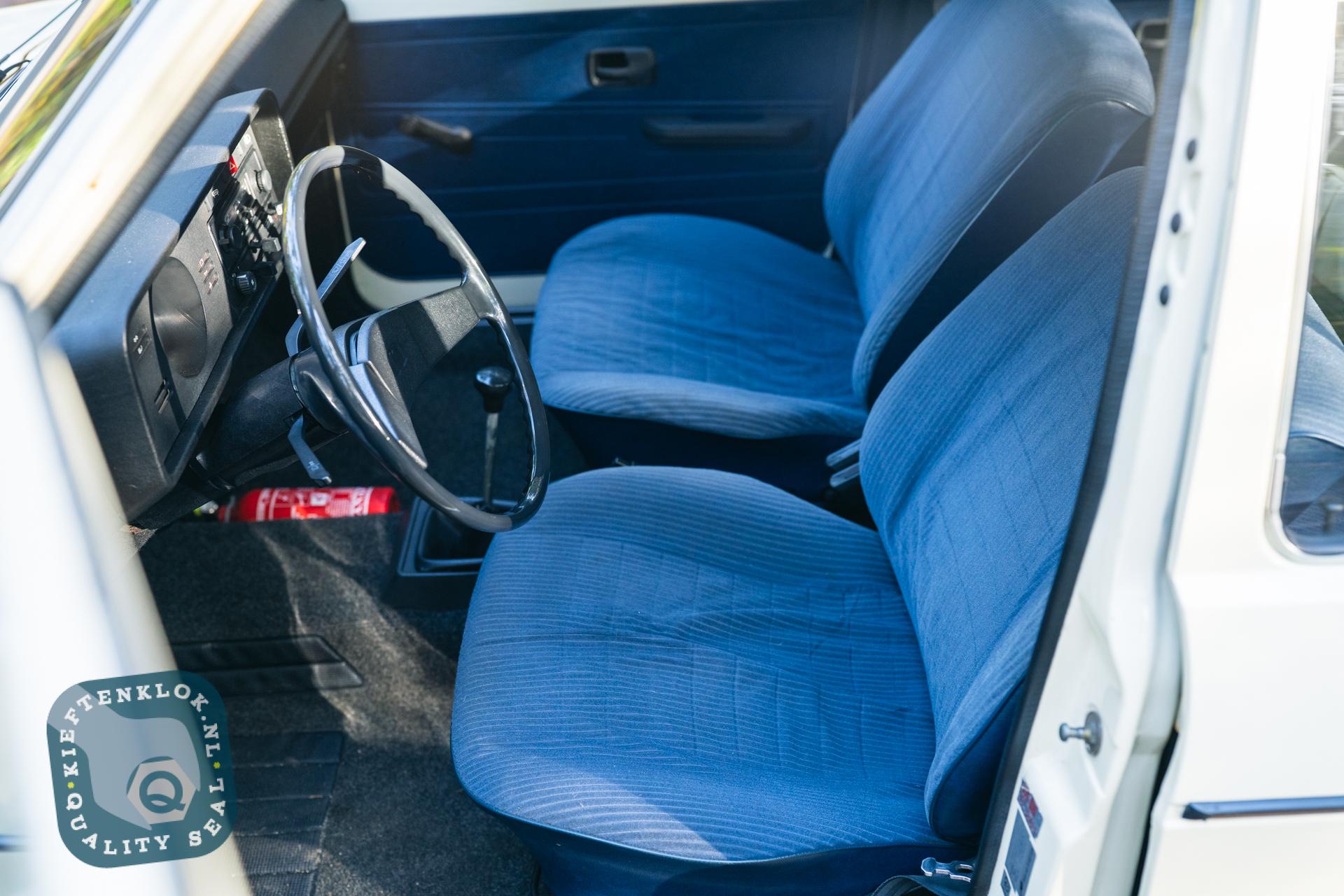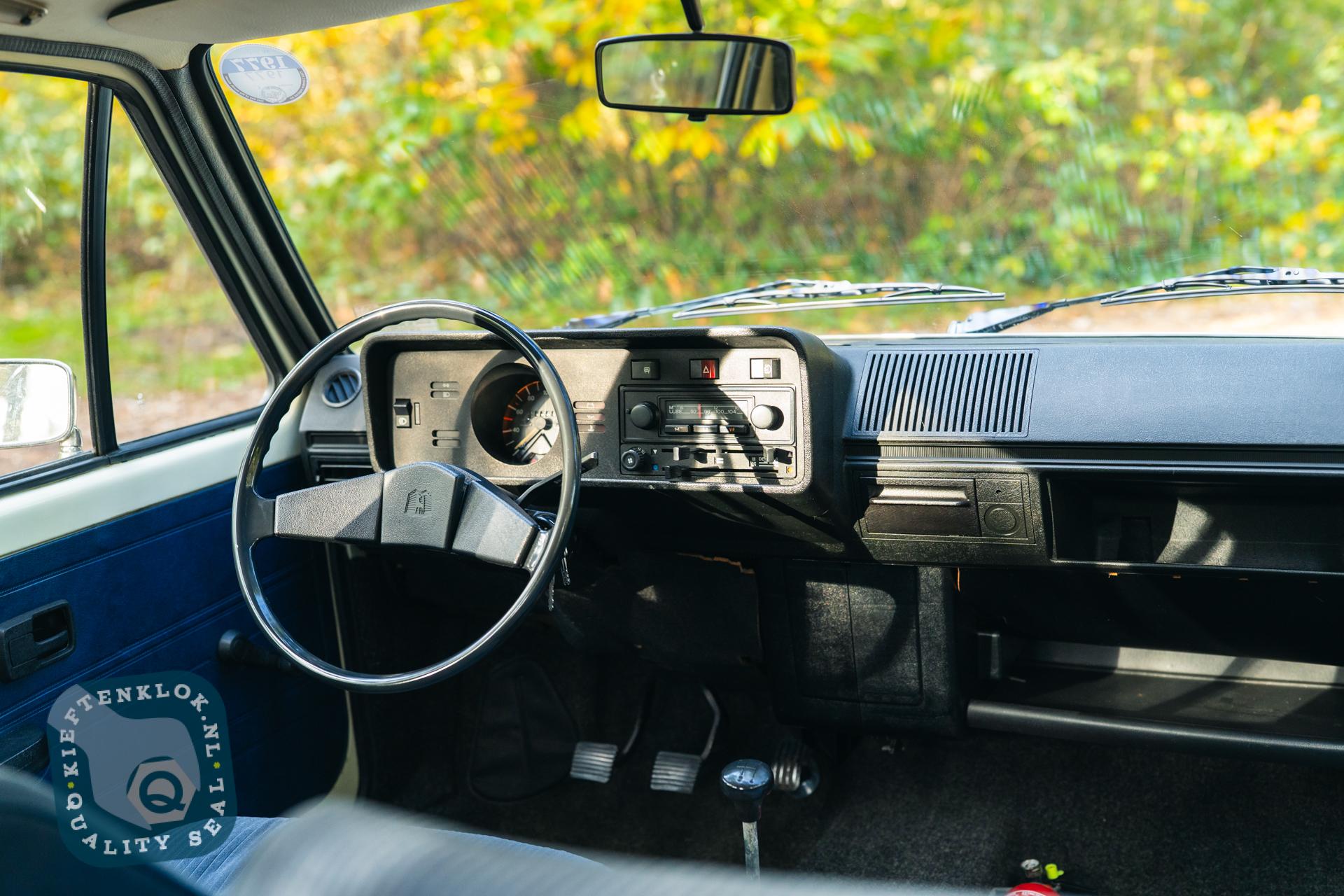 Dit is de praktische vijfdeursversie van de allereerste Golf-generatie, nog met de karakteristieke kleine chromen bumpers, chroom spiegels en chroom deurklinken. De auto is ongelast en vertoont enkel wat lichte gebruikssporen – precies wat je mag verwachten van een eerlijke klassieker.